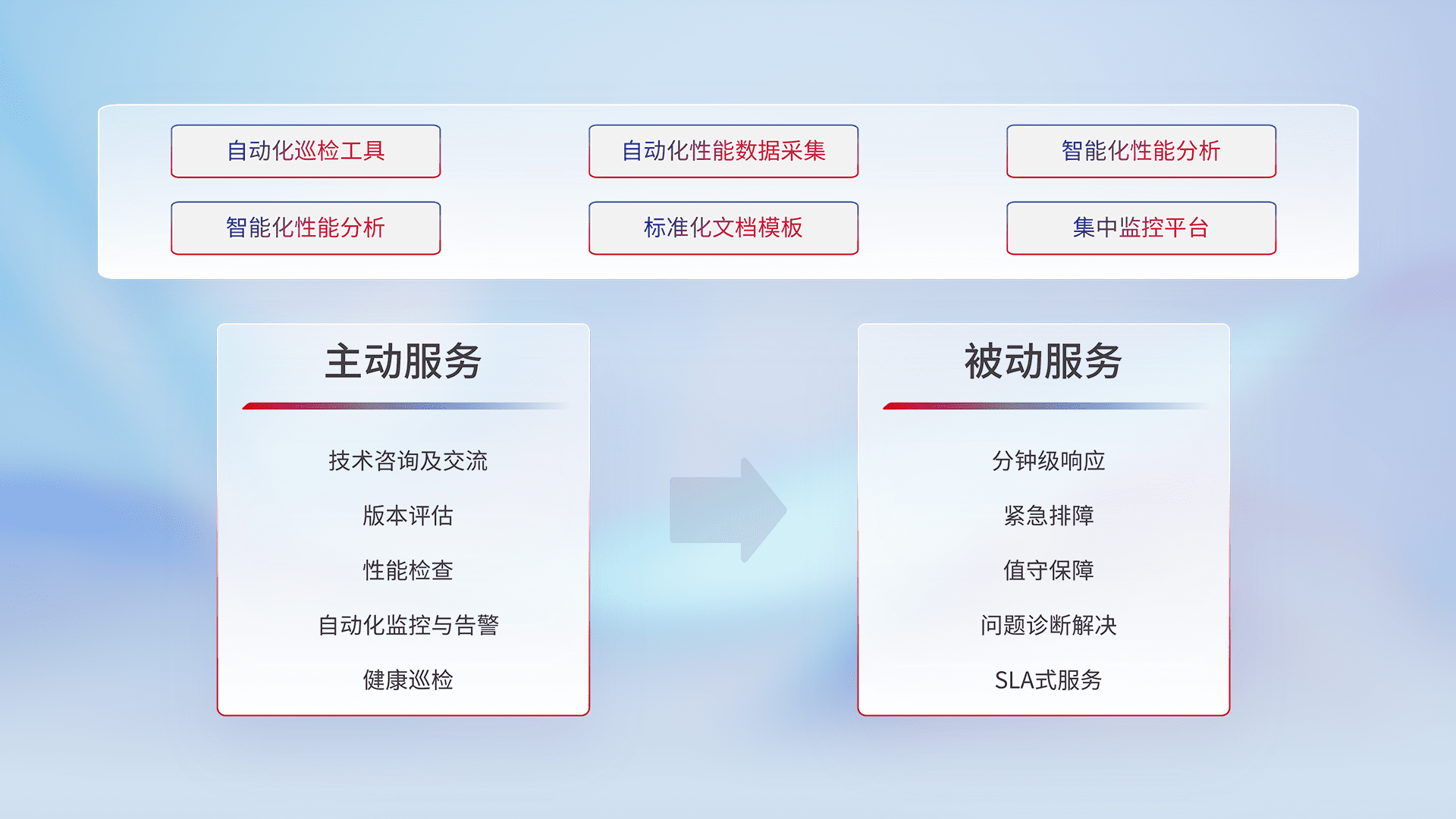 智能化工具和标准化文档,,,,保障服务质量,,提供主动服务(包含技术咨询、、版本评估、、、、性能检查、、、、自动化监控与告警、、、健康巡检)和被动服务包含(分钟级响应、、、紧急排障、、、、值守保障、、问题诊断解决、、、、SLA服务)。。
