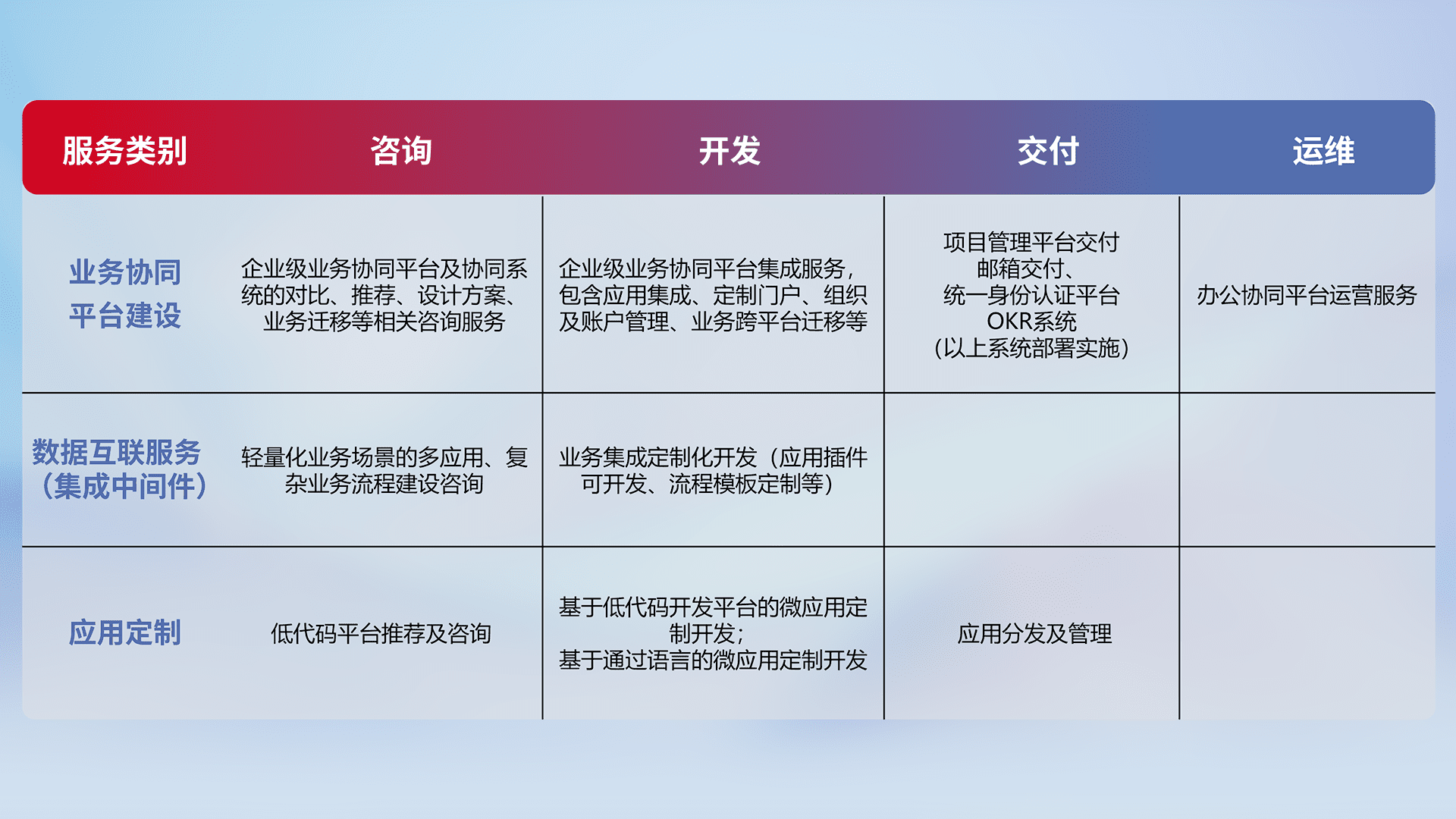 针对钉钉、、、企微、、、IDaas等平台级产品提供产品的规划、、、方案、、交付、、、、定制化开发等服务,,实现如统一协同办公、、、、智能客户服务、、混合会议管理、、、智能数据查询、、、、等业务场景,,,,实现数字化转型。。